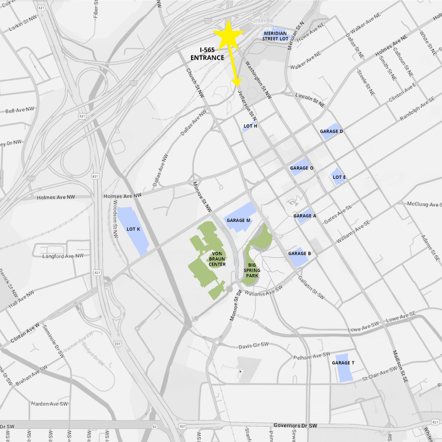 The Von Braun Center has an underground parking garage with limited spaces but offers convenient access directly into the VBC complex. The entrance is via Pollard St SW at Clinton Ave.